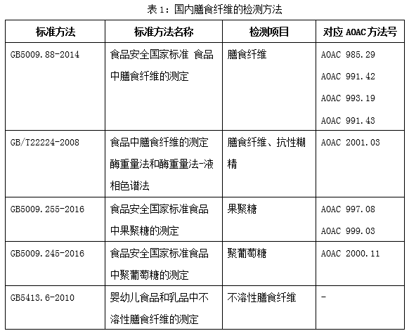 膳食纤维可分为不溶性膳食纤维、可溶性膳食纤维以及菊粉、聚葡萄糖等膳食纤维单体成分。不同的膳食纤维成分对应的检测方法可参考表1。