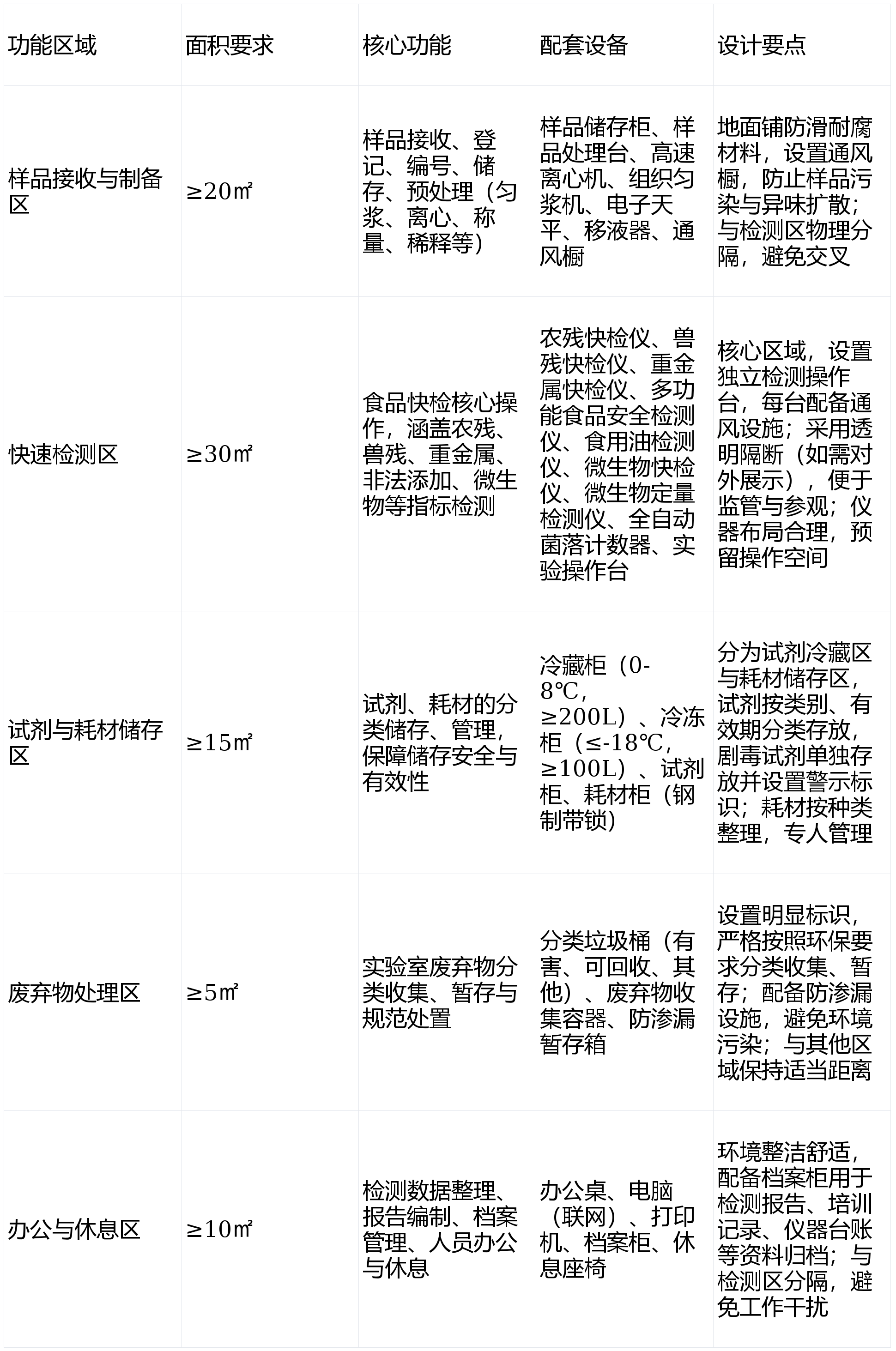 遵循“功能分区、流程合理、避免交叉、安全规范”的原则,结合食品快检实验室日常工作流程,划分5个独立功能区域,各区域设置明显标识,确保检测流程顺畅、避免交叉污染,具体布局如下: