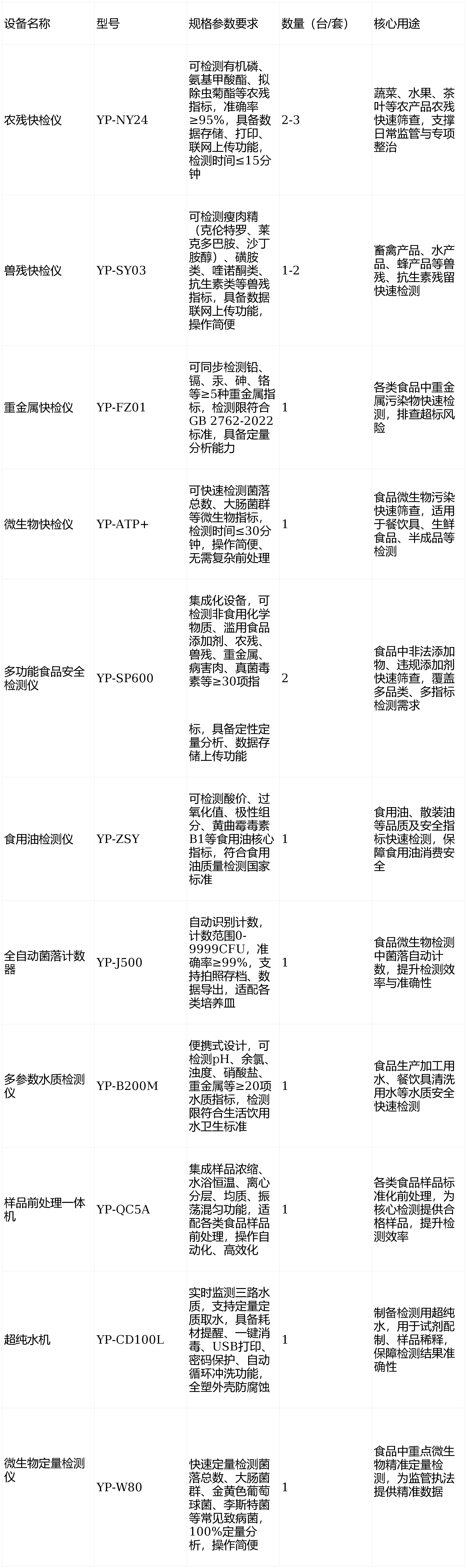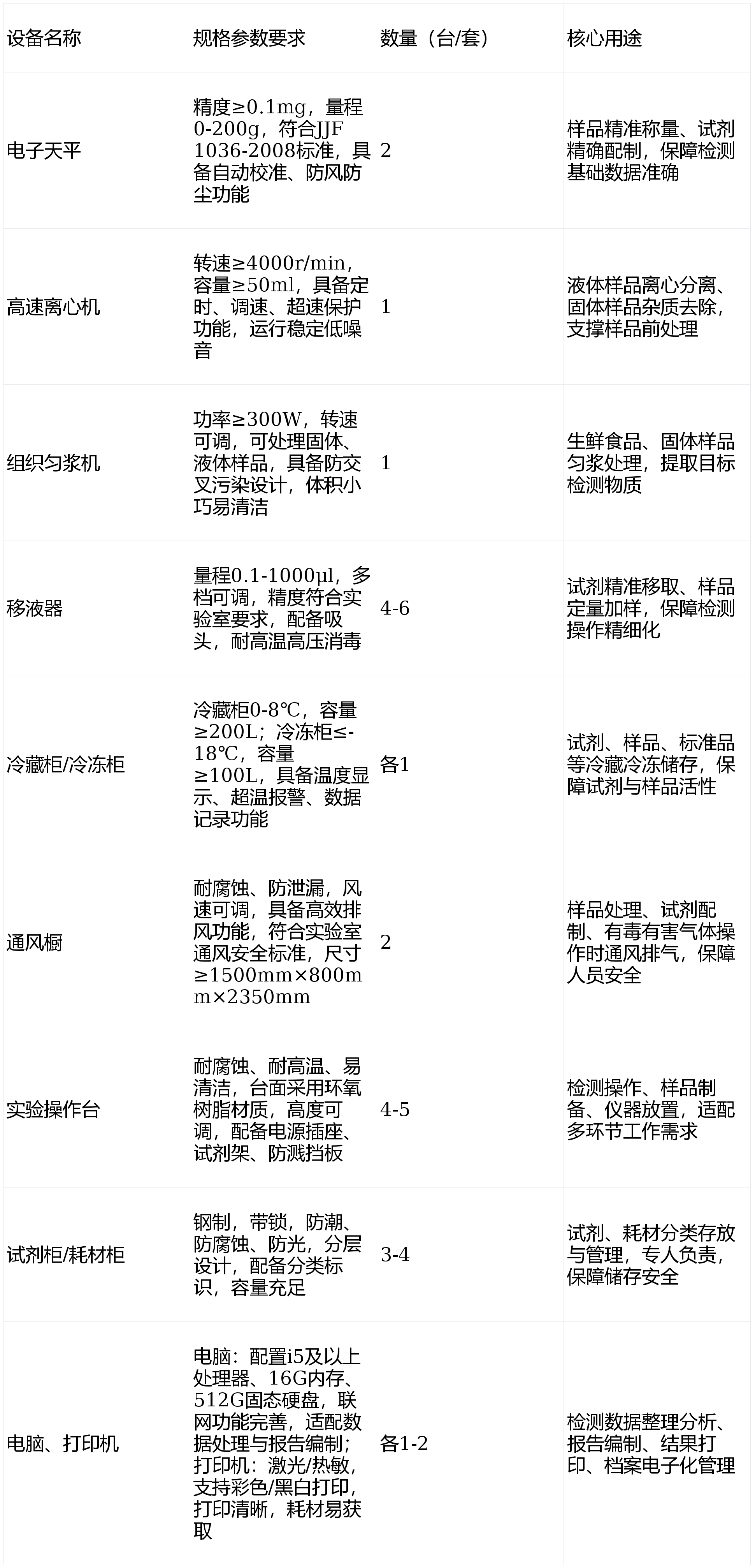 设备配置遵循“按需配置、技术先进、符合标准、实用高效、可持续发展”的原则,结合实验室检测能力目标与日常工作需求,配备核心快检仪器、辅助设备及应急设备,所有设备均符合国家相关标准,经校准、检定合格后投入使用,确保检测结果准确可靠。