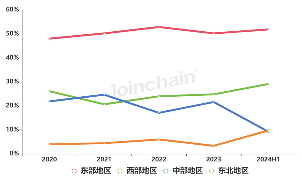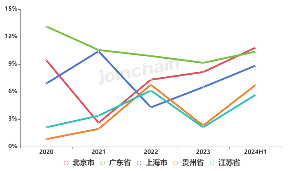 从区域分布看,2024年上半年东部地区采购金额占比最高,为51.89%,其次是西部地区29.14%。各区域采购金额占比趋势变化如图表8所示。省份方面,排名前五的省份有北京市、广东省、上海市、贵州省、江苏省。