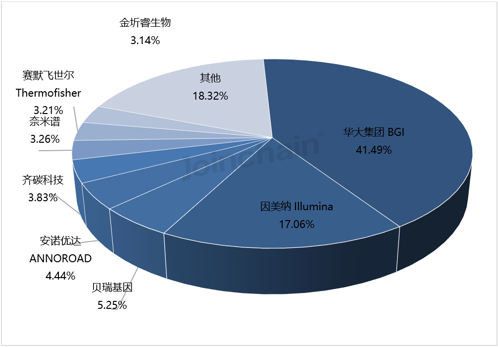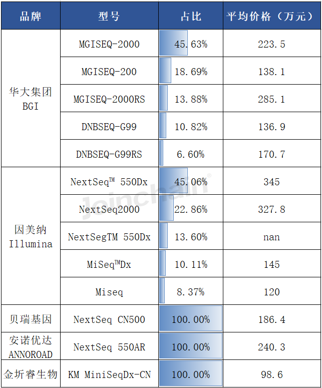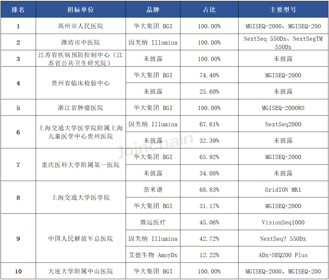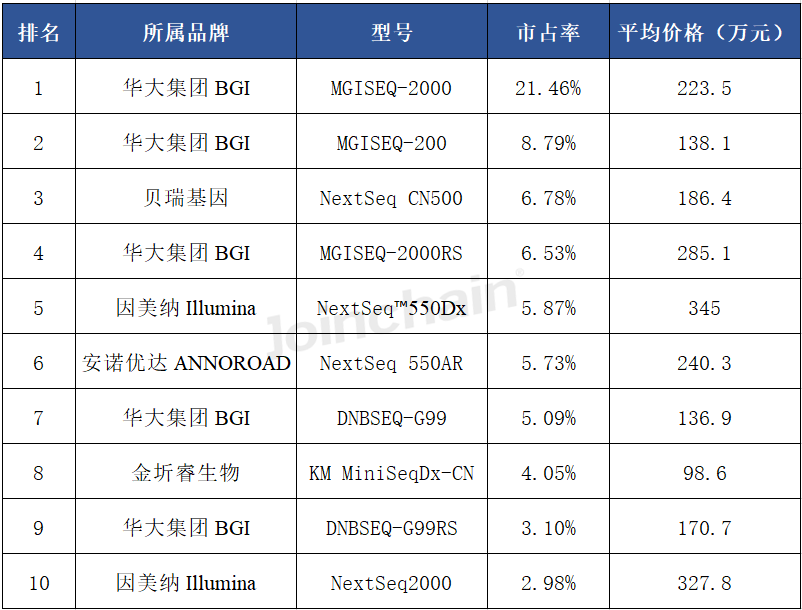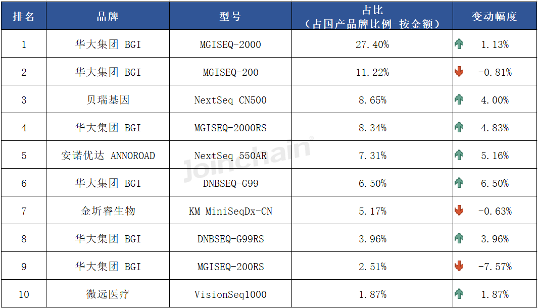 从具体型号上看,排名前三的型号分别来自华大集团的MGISEQ-2000、华大集团的MGISEQ-200和贝瑞基因的NextSeq CN500。