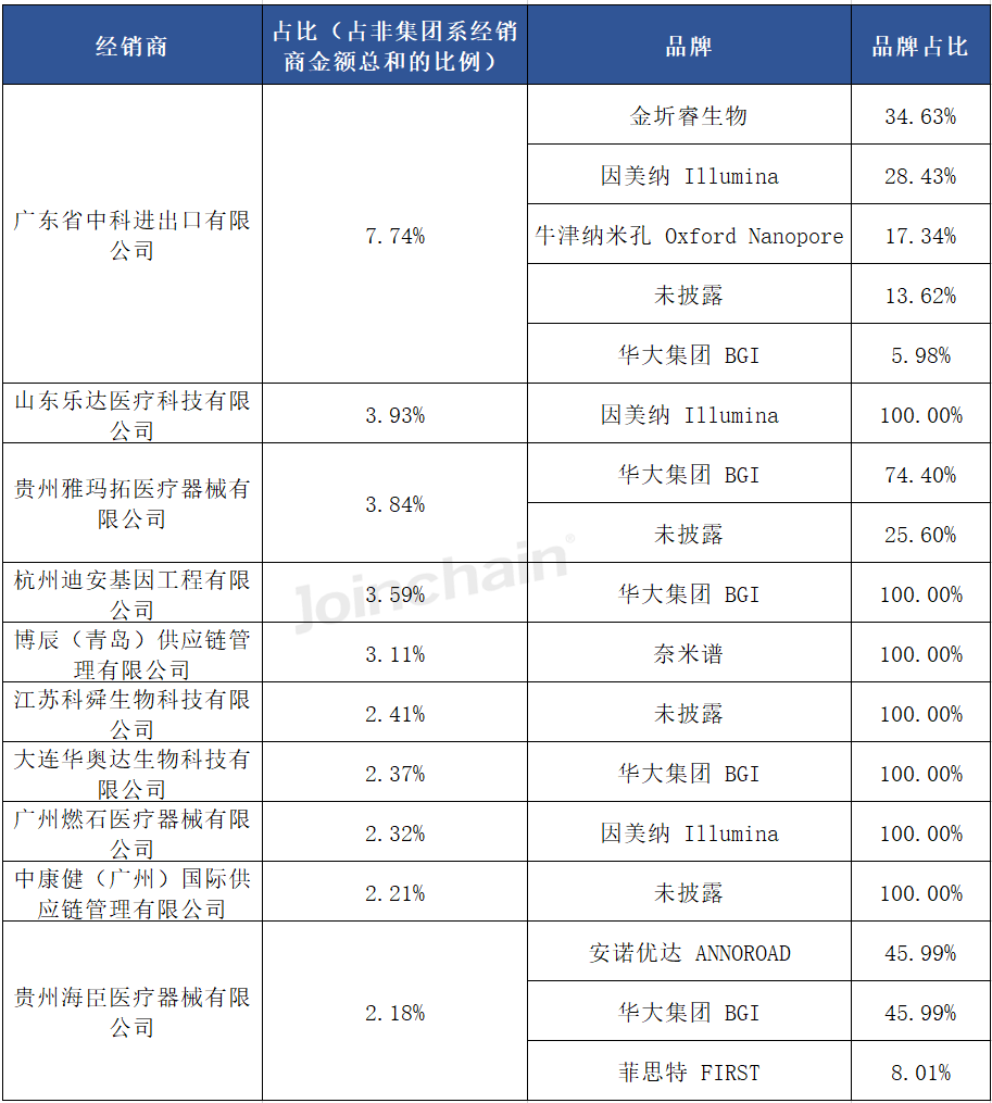 在非集团系经销商中,排名前三的分别为广东省中科进出口有限公司、山东乐达医疗科技有限公司和贵州雅玛拓医疗器械有限公司。
