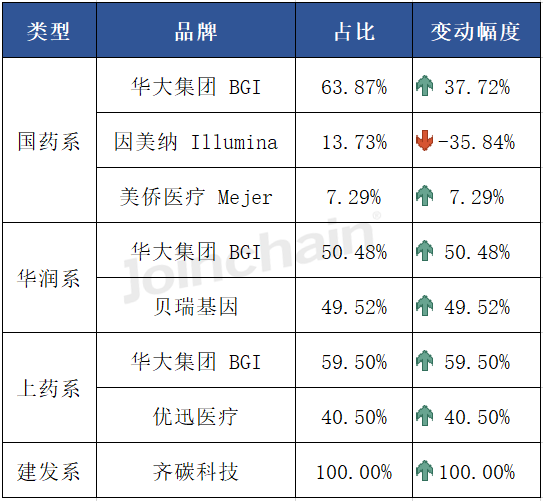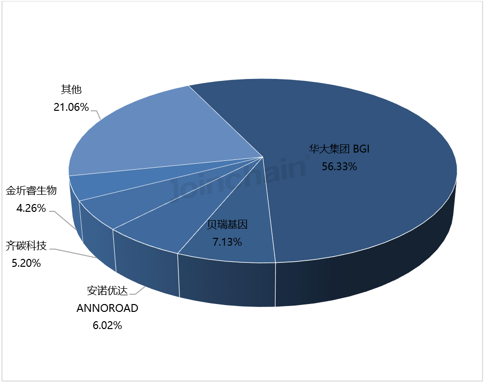 从各品牌主流型号来看,华大集团前五型号市占率之和占该品牌市场总额的95.62%;因美纳前五型号市占率之和占该品牌市场总额的100.00%;贝瑞基因前五型号市占率之和占该品牌市场总额的100.00%;安诺优达前五型号市占率之和占该品牌市场总额的100.00%;金圻睿生物前五型号市占率之和占该品牌市场总额的100.00%。