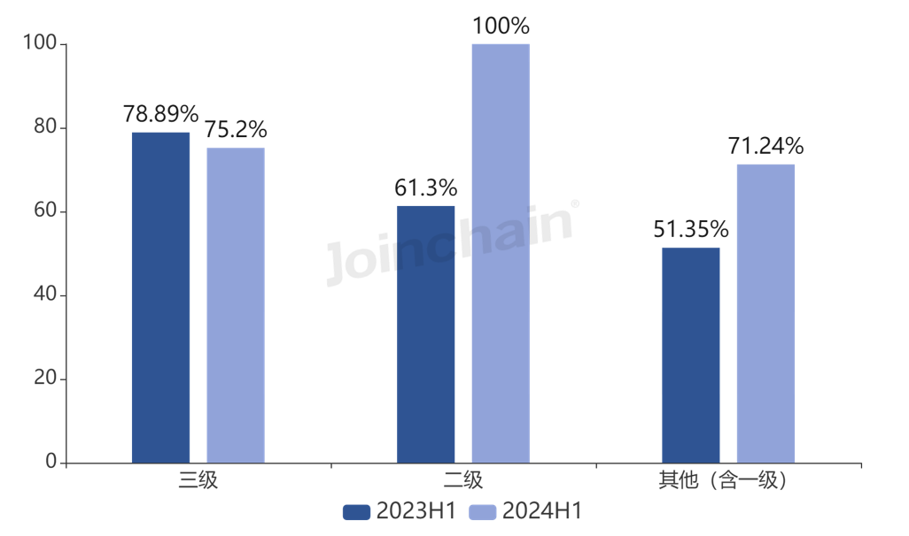 从医院品牌国产化率来看,2024年上半年三级医院国产品牌占比为75.20%,较去年同期下降3.69%;二级医院国产品牌占比为100.00%,较去年同期上升38.7%。