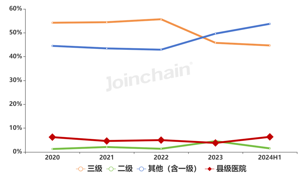 从采购单位类型上看,2024年上半年三级医院、二级医院采购占比分别为44.7%、1.52%;县级医院采购占比为6.35%。各类型采购单位采购占比趋势变化如图表6所示。